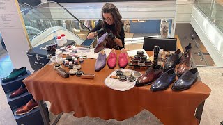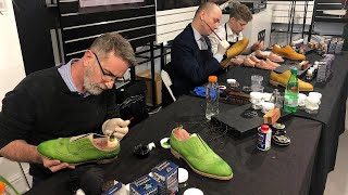 Renowacja i odnowienie koloru skór to jedno z wielu zastosowań barwników SAPHIR BDC Teinture Francaise. Zmiana koloru i personalizacja to drugie. Ale szczególną uwagę zwróć koniecznie na magiczny proces PATYNOWANIA BUTÓW, bo jego efekty naprawdę potrafią zwalić z nóg! Wysokiej jakości naturalne skóry pięknie się starzeją nabierając z czasem szlachetnej patyny (miejscowe przyciemnianie). Nowicjusz może się zdziwić, ale świadomi miłośnicy obuwia i skór uwielbiają ten efekt. Ręczne patynowanie obuwia i skórzanych akcesoriów to artystyczny proces, który jest inspirowany tymi naturalnymi procesami. Szybko awansował do rangi sztuki i od wielu lat organizowane są nawet Mistrzostwa Świata w patynowaniu obuwia i polerowaniu butów na wysoki połysk. Rywalizacja toczy się oczywiście przy pomocy barwników, kremów i past do butów marki SAPHIR. Finaliści malują wysokiej jakości buty marki TLB MALLORCA ze specjalnych niewykończonych skór z najlepszych garbarni na Świecie. Ale to nie jest jedyna droga do patynowania skór. Jeżeli masz do dyspozycji buty lub torebkę z dobrej skóry, której nie używasz, możesz usunąć z nich oryginalne wykończenie przy pomocy specjalnego zmywacza do skór, a następnie barwnikami SAPHIR BDC Teinture Francaise rozpocząć swoją własną patynację. Pamiętaj jednak, by po wchłonięciu i wyschnięciu barwników wykończyć malowanie przy pomocy kremu i pasty woskowej SAPHIR. Przykłady amatorskich i profesjonalnych procesów patynowania skór znajdziesz w kolejnych sekcjach opisu (zdjęcia).